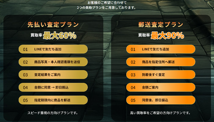 買取ワイルドの先払い買取は、「スピード重視の先払い査定プラン」と「高価買取重視の郵送査定プラン」の2種類から選べます。